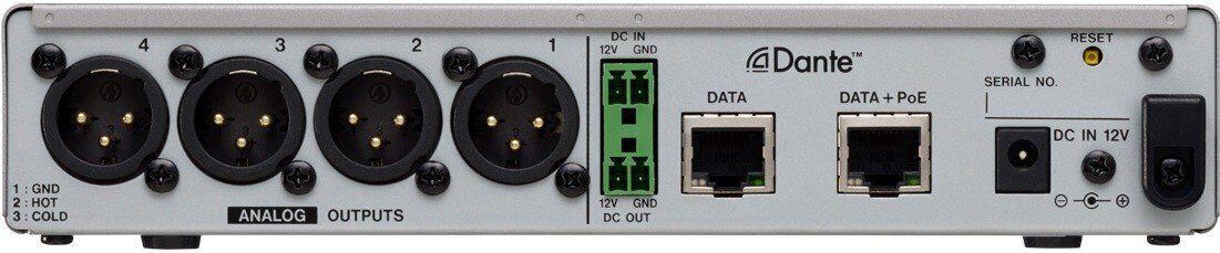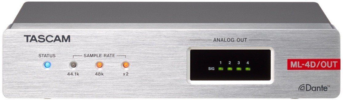 Tascam ML-4D/OUT-X - это компактный преобразователь, который преобразует входные сигналы Dante в 4-канальные линейные выходные сигналы. Имея половину размера стандартной стойки 1U, ML-4D / OUT-X подходит для различных систем Dante в качестве изысканного аналогового выходного устройства. Встроенный микшер DSP позволяет маломасштабным системам в полной мере работать с различными моделями ввода / вывода, которые предлагает серия TASCAM Dante Compact Processor. ML-4D / OUT-X поддерживает до 96 кГц / 24 бита и использует разъемы XLR для аналогового линейного выхода.