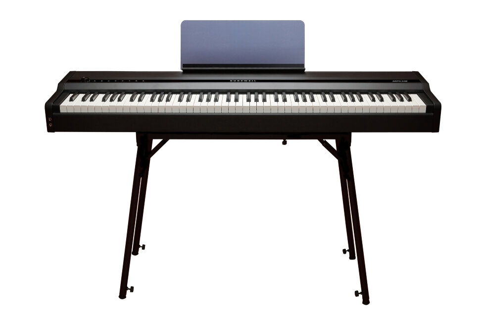 Станцию легко переносить, используя ее как портативную клавиатуру или на подставке. Она легка и универсальна для музыкантов, находящихся в дороге. В комплект также входит педаль сустейна, подставка для нот, USB кабель, Smart кабель, блок питания.