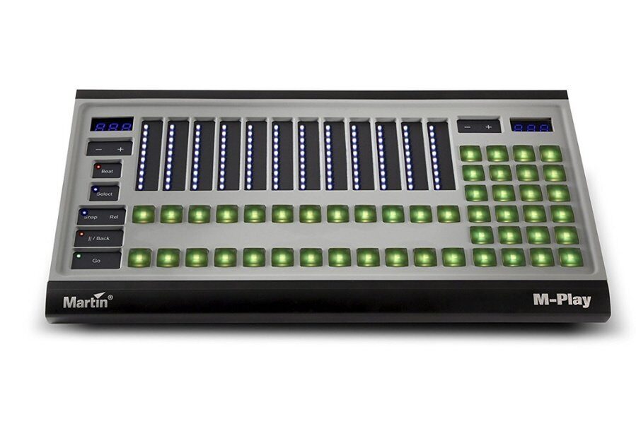 Martin M-Play – идеальный компаньон для M-Touch и программы M-PC. 12 фейдеров с настройкой усилия позволяют вам работать с playback, а 48 кнопок (также с настройкой силы нажатия) могут служить функциональными клавишами или обеспечивать доступ к playback. M-Play предоставляет доступ к одному DMX юниверсу на 512 каналов. Управление/пользовательский интерфейс Навигационный банк: вверх/вниз с цифровым дисплеем (Секция 1) Навигационный банк: вверх/вниз с цифровым дисплеем (Секция 2) Секция Main Go с кнопками Snap, Release, Pause и Go Кнопки Beat и Select   Воспроизведение (Playback)  12 сенсорных фейдеров Playback с 1 кнопкой (с настройкой силы нажатия), Playback секция 1 12 кнопок Playback (с настройкой силы нажатия), Playback секция 1 24 кнопки Playback (с настройкой силы нажатия), Playback секция 2 Конструкция Степень защиты: IP20 Подключение  1 x подключение DMX: 5-pin XLR  1 x USB 2.0 вход.