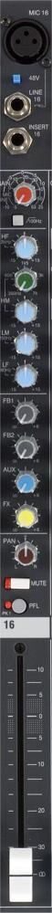 Новая консоль содержит 24 моно каналов [XLR] с микрофонным предусилением и два линейных стерео [TRS] канала. Микрофонные линейки имеют фантомное питание с индивидуальным включением, обрезной фильтр (100 Гц). 4-х полосный эквалайзер с параметрической серединой. Каждый из восьми моно и двух балансных стерео каналов содержит кнопки mute и solo (в режиме PFL). Помимо этого на каждый канал приходится по четыре посыла: два на мониторы в режиме pre-fade, один в режиме post-fade и один на внутренний процессор эффектов также в режиме post-fade.