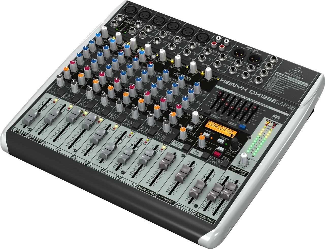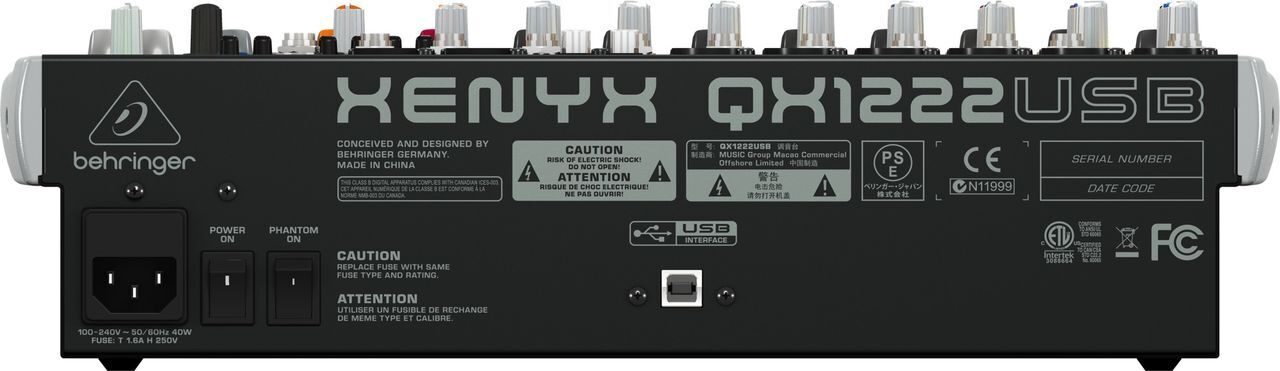 QX1222USB оснащен 6 моно микрофонными входами. Два дополнительных канала могут быть использованы для стерео линейного уровня устройств, такие как клавишные или звуковые модули. Микшер оборудован каналом вставки для входов 1-4, стерео 7-полосным графическим эквалайзером и FBQ системой обнаружения обратной связи. Благодаря встроенному порту ULM приемника можно наслаждаться функциональностью беспроводного микрофона. Другими характеристиками являются полноразмерные фейдеры для MON и FX посылов, XPQ 3D стерео эффект объема (создает расширение, увеличивает стерео отображение) и удобная функция Voice Canceller для караоке приложений.