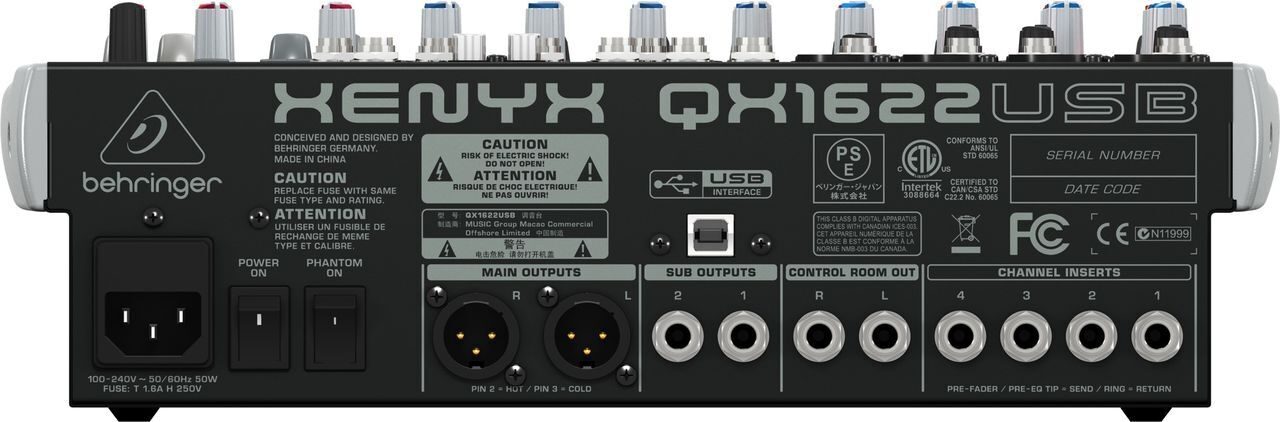 QX1622USB характеризуется 4 XENYX микрофонными входами с каналом ввода, компрессорами и 3-полосным эквалайзером с полупараметрической полосой средних частот. 4 стерео канала линейного уровня предлагают расширенную точную настройку через 4-полосный эквалайзер, который чрезвычайно удобный для регулировки критических средних частот клавишных инструментов. Aux посыл и индивидуальные каналы могут быть направлены на две подгруппы. Благодаря встроенному порту ULM приемника можно наслаждаться функциональностью беспроводного микрофона.