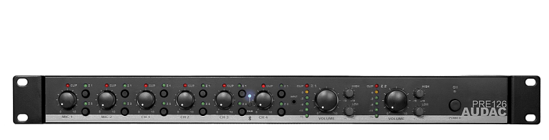 PRE126 – простой в использовании, но функционально мощный 6-канальный двухзонный стереофонический предусилитель высотой 1U, монтируемый в 19'' стойку. В дополнение к стандартным входам, оснащен приемником Bluetooth (микшируется с каналом 3) и входом стереоаудио miniJack 3,5 мм (микшируется с каналом 4). Устройство имеет переключатель выходного сигнала стерео/моно и возможность удаленного мьютирования. Подходит для широкого диапазона различных приложений
