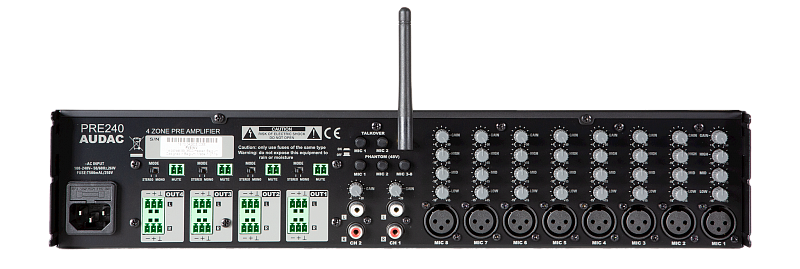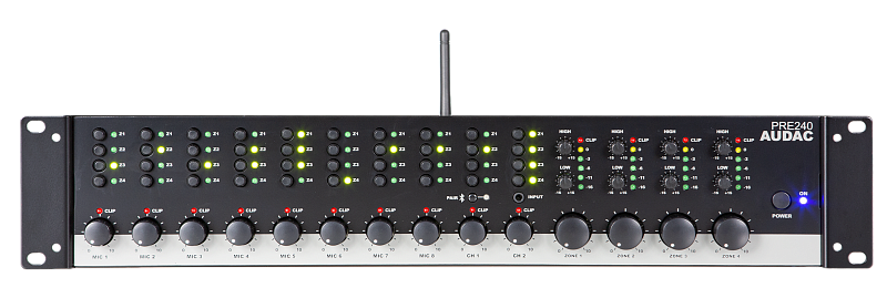 PRE240 – 10-канальный четырехзонный предусилитель-стереомикшер с Bluetooth, простой в использовании и многофункциональный. 8 его входных каналов могут переключаться с микрофонного на линейный уровень сигнала, они оборудованы трехполосным регулятором тембра. Первые 2 имеют переключатели приоритета и фантомного питания 48 В. Оставшиеся 2 являются прямыми линейными стереовходами. Канал Bluetooth совмещен с каналом 9.