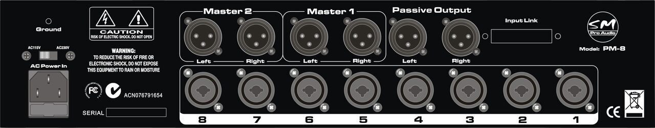 PM8 – многоканальный пассивный микшер/сумматор высокого класса, который выполняет все требования домашних и профессиональных студий. Каждый входной канал характеризуется собственными pan, mute и поворотным регулятором громкости. Восемь профессиональных входных combo разъемов (XLR & " TS) и три сбалансированных XLR стерео выхода находятся на задней панели. 25-pin D-sub разъем также доступен для прямого подключения совместимых систем. Все разъемы входов и выходов надежно закреплены на корпусе устройства, что обеспечивает постоянную надежность и дает уверенность в качественной работе устройства при любых условиях. Микшер PM8 оборудован профессиональным внутренним источником питания, который подходит для работы с напряжением сети переменного тока 110/115В – 220/230/240В. На задней панели с левой стороны имеется переключатель напряжения.