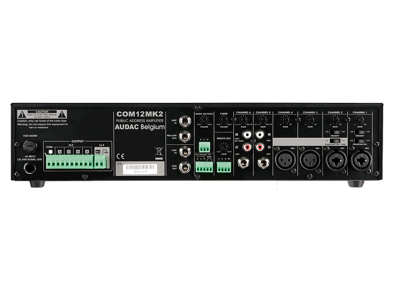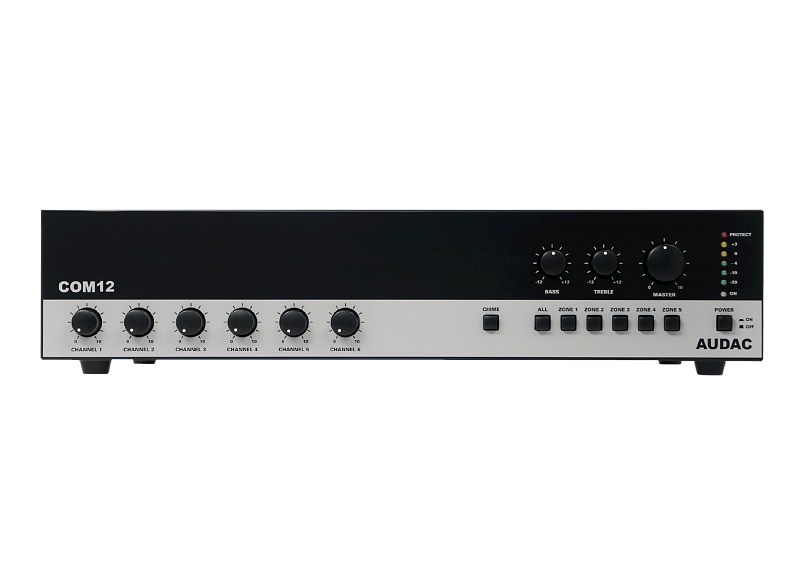 COM12MK2 – усилитель-микшер для трансляционной линии 100 В. Пять выходов на трансляционную линию 100 В, один выход на низкоомную АС (4 Ом). Исчерпывающий набор небалансных и балансных входов. Номинальная мощность – 120 Вт RMS. Каждая из пяти зон 100 В управляется «вкл.»/«выкл». Схема защиты. Возможность установки в стойку 19''.