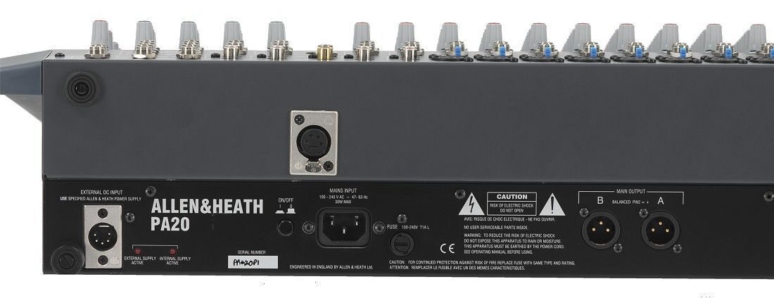 Для того, чтобы звучание PA20 было ровным и в тоже время легко настраиваемым, каждый канал имеет четырехполосный эквалайзер с регулировкой НЧ в области 60 Гц, низкой середины в области 250 Гц, параметрического фильтра в области верхней середины (от 300 Гц до 3 кГц), ВЧ в области 12 кГц. Выбор регулировок частот достаточно удобен, особенно в области низкой середины. Подъем или ослабление частот на 15 дБ дают ровную частотную характеристику, за что и знамениты консоли от Allen&Heath.