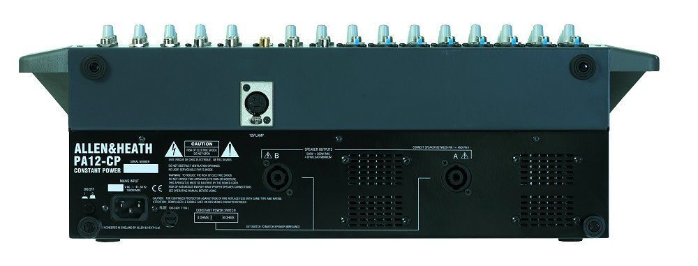Вес PA12-CP составляет 21 кг вместе с ручкой для переноски и дополнительными креплениями, при помощи которых аппарат крепится в стандартный 19-ти дюймовый рэк. Внутри содержится новый усилитель "постоянной мощности", обеспечивающий 500 Вт (RMS) на канал при нагрузке 4 или 8 Ом. Вдобавок имеется возможность включения/отключения фантомного питания и обрезного НЧ-фильтра на каждом моно канале, внутренний процессор эффектов, аналоговый параметрический эквалайзер и цифровой выход (S/PDIF). Наряду с возможностью выбора между цифровым или аналоговым выходом для записи на 2 дорожки, также существует отдельный аналоговый стерео вход. Каждый из 8 моно и 2 балансных стерео каналов содержит кнопки mute и solo (в режиме PFL). Помимо этого на каждый канал приходится по 4 посыла: 2 на мониторы в режиме pre-fade, один в режиме post-fade и один на внутренний процессор эффектов также в режиме post-fade. Каждый из 2 фейдеров посыла на мониторы имеет кнопки mute и solo (в режиме AFL), в то время как мастер-фейдер только кнопку mute. Также в мастер секции существует возможность суммирования левого и правого канала в один моно канал, который имеет отключаемый НЧ-фильтр для посыла низкочастотной составляющей сигнала на отдельный сабвуфер.