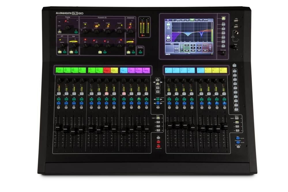 Allen & Heath GLD-80 обладает интерфейсом, стилизованным под классическую аналоговую консоль с 8.4 дюймовым сенсорным дисплеем. Полностью настраиваемые пользователем банки позволяют выполнить быстрое и удобное назначение всех входных и выходных каналов на фейдера. Консоль имеет 20 канальных моторизированных фейдеров в 4 банках, жидкокристаллические канальные дисплеи с возможностью изменения имени и цвета, плюс вращательные регуляторы для прямого доступа к гейну, панорамированию и Aux/FX посылов. Локально на консоли размещены 4 XLR микрофонных/линейных входа, 4 XLR выхода, 4 входа RCA, 2 RCA выхода и цифровые интерфейсы форматов SPDIF и AES3.