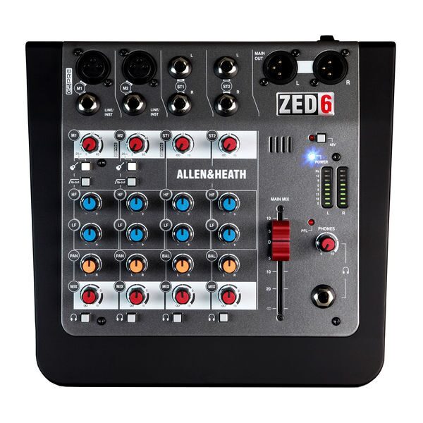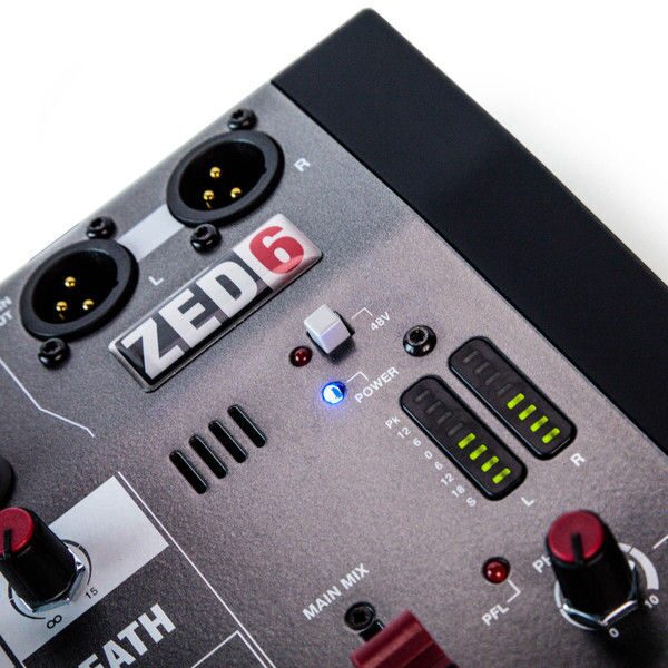 Микрофонные входы Allen & Heath ZED6 представлены двумя разъемами XLR, на которых также есть и предусилители. Они созданы гуру аналогового звука, Майком Гриффином, а сама схема аналогична используемой в студийной консоли GS-R24. Также данные микрофонные входы запараллелены с соответственно двумя монофоническими линейными и инструментальными входами, что позволяет использовать на всех них НЧ-фильтры, ручки регулировки паннинга, двухполосные эквалайзеры и регуляторы гейна до +60 дБ. Эквалайзер также присутствуют и на двух стереофонических входах, где вместо регулировки паннинга и гейна вам предлагает регулировать баланс и повышать уровень выходного сигнала на +15 дБ. Кроме того, на каждом канале есть кнопка посыла сигнала в наушники, чей выход на разъеме 1/4" TRS Jack расположен в нижней правой части микшера рядом с ручкой регулировки уровня громкости. Мастер-выходы выполнены на XLR и также расположены на лицевой панели, а за уровнем звука можно следить с помощью двухполосного восьмисегментного индикатора уровня с клиппированием. Есть фантомное питание +48 Вольт для конденсаторных микрофонов.