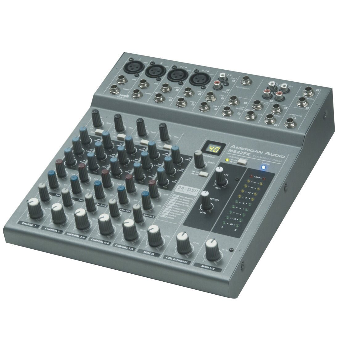 American Audio M822FX микшерный пульт, 8 каналов, 2 моно+3 стерео входных канала/ Stereo main выход и выход ALT 3/4, Trim с LED- индикаторами пиковых нагрузок, HPF, 3-х полосный эквалайзер, 1 AUX with Pre/Post switch, 1 EFX и PAN для моно-входа, Trim с LED- индикаторами пиковых нагрузок , HPF (канн.3-6), 3-х полосный эквалайзер , 1EFX и Balance для стерео входа, Main L/R, AUX возврат, HP/Control Room и фантомное питание, Встроенные 24-bit DSP эффекты со 100 пресетами, EFX ON/OFF & EFX уровень, симметричный разъем-XLR 1/4 и jack 1/4 для моно-входа, разъем-XLR 1/4 для стерео (канн.3-6), pазъем jack для стерео входа (канн 7- 8), разъем 1/4 для stereo возврата и разъем jack для Tape. Phone jack 1/4 for Main, ALT 3/4, AUX посыл, EFX посыл, Control Room & Headphone. Габариты 247x65x290мм. Вес: 2,8 кг
