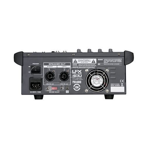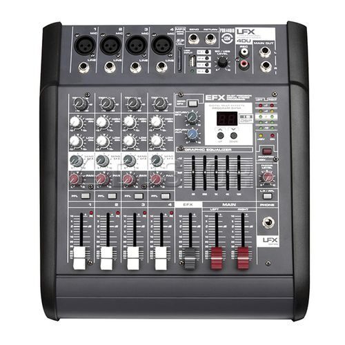 Микшерный пульт 4 канала с USB. Мощность 200Вт (100Вт + 100Вт/4 Ом) RMS, 16 цифровых эффектов, 2-полосный эквалазер на канал, 5-типолосный эквалайзер на мастер, дискретный усилитель микрофона с очень низким уровнем шума с питанием +48V Phantom, AUX SEND, AUX RETURN, Выход на наушники, USB-разъемразмеры 290х320х80мм, вес 4 кг