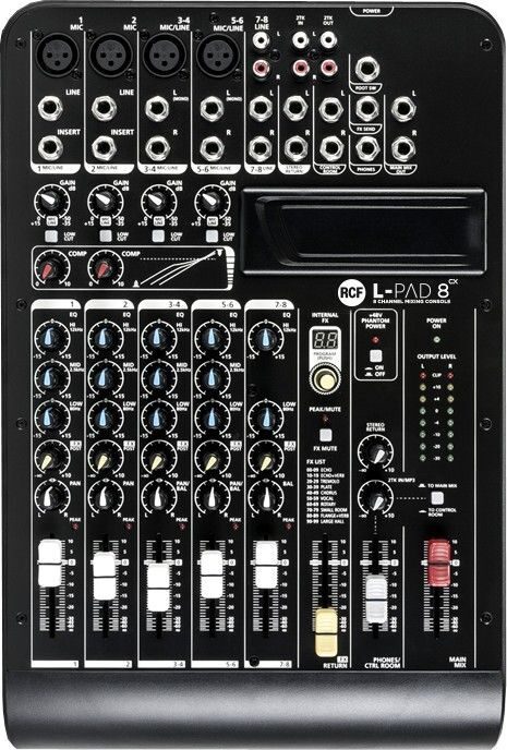 Портативный аналоговый микшерный пульт RCF L-PAD 8CX очень хорошо зарекомендовал себя в ситуациях, когда требуются несколько стереофонических входов с возможностью смешивания. У данного решения таких входов три, а кроме того имеются 4 монофонических (микрофонных) входа и 1 AUX. От модели RCF L-PAD 8C этот пульт отличается наличием у него 1 посыла на эффекты и встроенным процессором эффектов с 99 пресетами. Два микрофонных входа оснащены компрессорами.