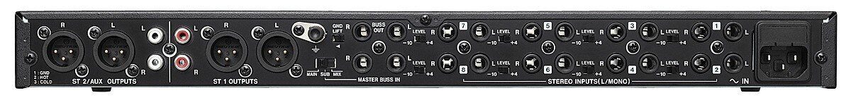 - Дополнительные балансные вход и выход мастер-шины (входной сигнал может быть выбран между ST1, ST2/AUX and Mix)