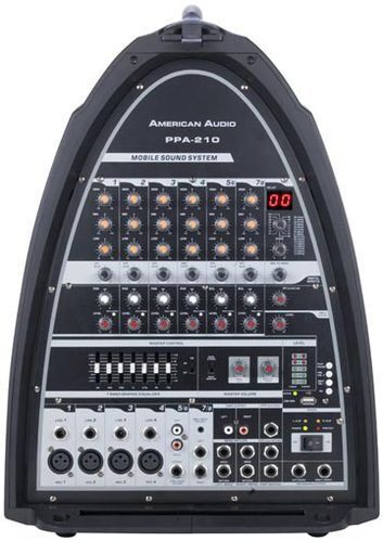 American Audio PPA210 мобильный акустический комплект, состоит из: 2-х АС (10", dr 1"), 8-канальный активный микшерный пульт с процессором эффектов, динамический микрофон +коммутация.Габариты: 865*435*575, 21 кг .