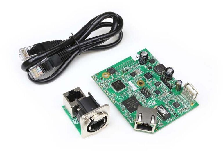 ANI22 – модуль сетевого интерфейса Dante, 2 входа, 2 выхода, для использования с усилителями серий SMA с частотой дискретизации 48 кГц и квантованием 24 бит, поддержка 100/1000BaseT. Задержка сигнала не превышает 5 мс. Позволяет интегрировать усилитель с существующей мультимедийной системой, которая использует интерфейс Dante для передачи сигналов между устройствами.