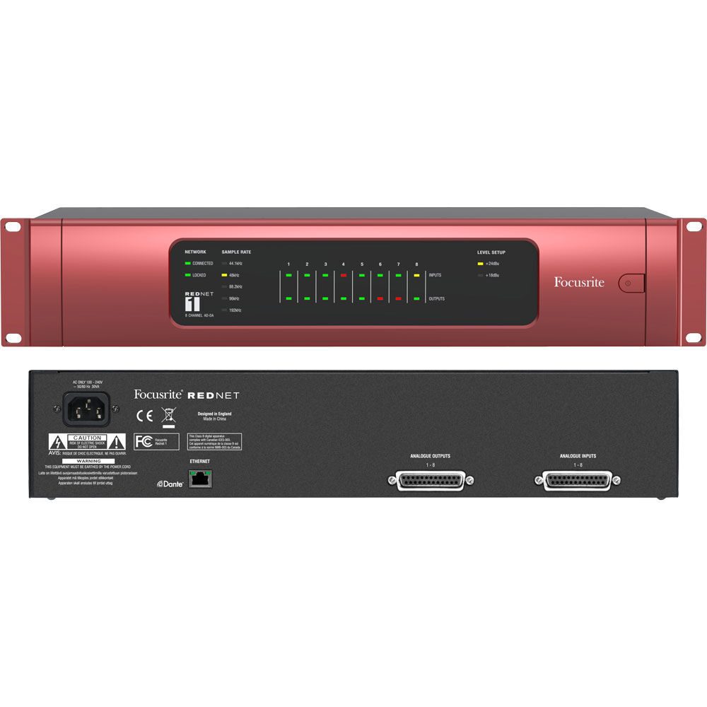 RedNet 1 – это 8-канальный аудиоинтерфейс системы Rednet с возможностью аналого-цифрового и цифро-аналогового преобразования для использования с компьютером PC или Mac. Доступно восемь входов и восемь выходов (DB25). Подключение к сети Dante осуществляется через Ethernet. Устройство можно разместить в любом нужном месте, в том числе на большом расстоянии от компьютера, и управлять удаленно через сеть. Возможно использовать любой удобный пакет DAW для работы со звуком. Поддерживается качество аудио 16/24 бит, 44,1/48/88,2/96 кГц. При этом технология Dante дает возможность получить до 128 входных и 128 выходных каналов, а с применением опциональной карты RedNet PCI достигается минимальная задержка – 3 мс при любой частоте дискретизации. Элементы индикации расположены на передней панели устройства, сзади расположены все разъемы для подключения. Модель заключена в прочный металлический корпус яркого красного цвета, устанавливается в рэк, имеет стандартную ширину 19 дюймов (48.3 см).