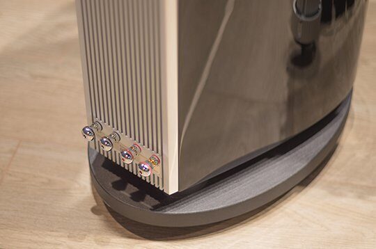 В напольных АС новой серии кроссовер был перемещен из плиты основания в основной корпус колонки, что дало возможность создать более стабильный и свободный от резонансов фундамент. Вместо прежней, открытой конструкции, новое основание изготовлено из массива алюминия весом целых 35 кг. Это позволило снизить центр тяжести и сбалансировать вес «турбинной головы» СЧ-динамика. Основание более крупных колонок серии 800 Diamond оснащено встроенным механизмом с выдвижными шипами и роликами, которые позволяют легко передвигать акустические системы по полу на нужное место. Для замены роликов на шипы ранее нужно было проделать целую операцию, повалив колонку набок. Теперь для новых АС 800 Diamond это не так – у них уже имеются встроенные шипы, которые можно выдвинуть или убрать простым вращением барашковых винтов.