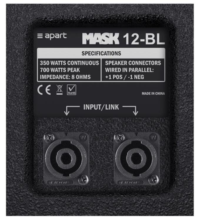 Громкоговоритель подключается к низкоомному усилителю с минимально возможной нагрузкой 4 Ом или 8 Ом. К выходу усилителя 4 Ом можно подключить параллельно до четырех MASK12 (по 2 шт. на канал). На выход 8 Ом можно подключить только до 2-х MASK12 (по 1 шт. на канал).
