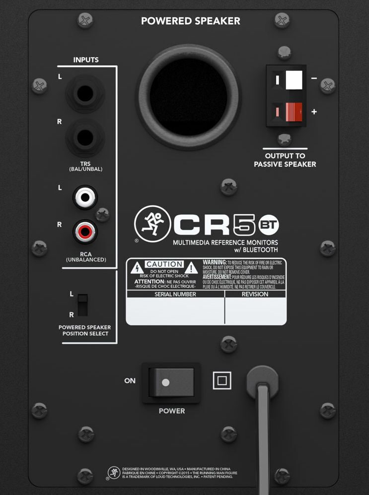 В монитор встроен усилитель, работающий в классе A/B. Мощность усилителя составляет 50 Вт. Коммутация монитора имеет следующие разьемы, это стереовходы TRS (х 2) и RCA (х 2). На фронтальной панели монитора есть дополнительный AUX-вход и стереовыход для подключения наушников. Монитор имеет достаточно небольшие размеры 259 мм. х 175 мм. х 229 мм. и вес - 6,8 кг. Активные студийные мониторы MACKIE CR5BT станут хорошим приобретением для общего и профессионального использования.