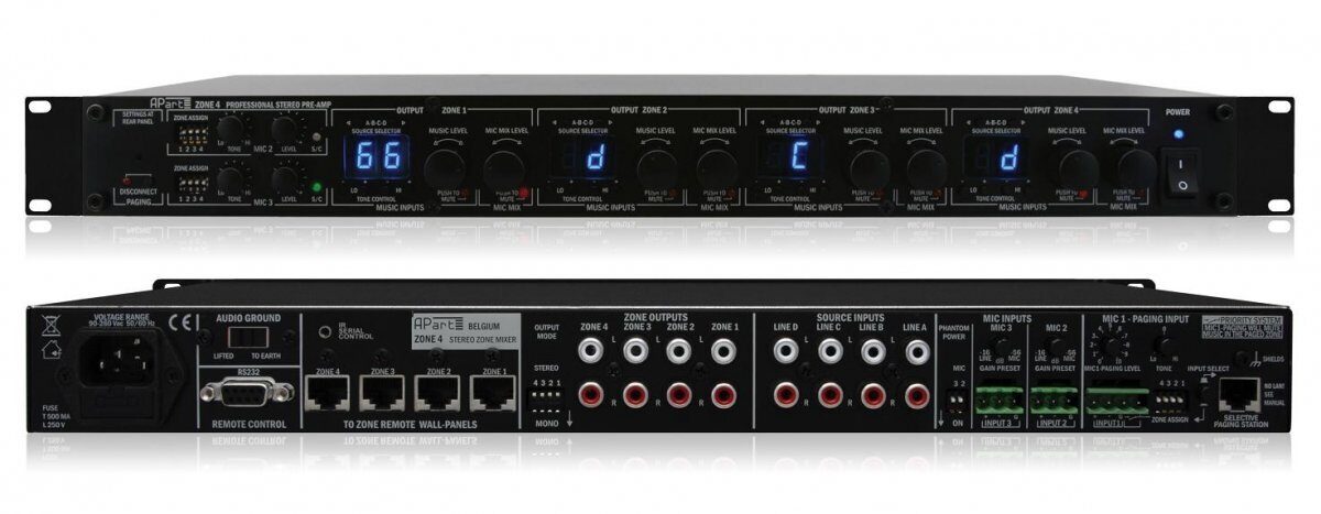 ZONE4 - многофункциональный предварительный усилитель. Общая конфигурация - (3 микрофонных + 4 линейных входа) x 4 линейных выхода. Фактически устройство является матричным коммутатором, любые входные сигналы можно коммутировать с любым линейным выходом предусилителя. Управление ZONE4 осуществляется на передней панели устройства или с удаленных контроллеров управления ZONE4R, которые можно расположить непосредственно в зонах трансляции/озвучивания и на месте выбирать нужный источник сигнала и регулировать громкость. К предварительному усилителю можно подключить всего до 8-ми удаленных контроллеров кабелем UTP (до 100м). ZONE4 также позволяет подключать микрофонные станции с селектором на 4 зоны MICPAT-4 (всего до 4-х микрофонных панелей кабелем UTP до 100м к входу MIC1 - RG45). Предусмотрено управление устройством по RS232. Для первого микрофонного входа (MIC1) предусмотрено включение функции приоритета. Для всех входов и выходов устройства можно отрегулировать уровень сигнала и уровень ВЧ и НЧ. Блок может устанавливаться в аппаратный шкаф или стойку 19" с помощью креплений входящих в комплект поставки. Питание предусилителя 220В АС.