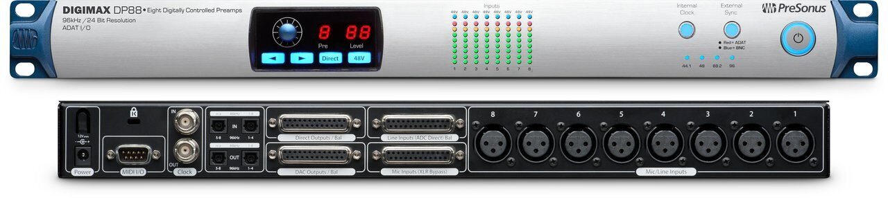 Новый 8-и канальный блок микрофонных предусилителей и AD/DA конверторов Presonus DigiMax DP88, предназначен для работы совместно с устройствами, имеющими интерфейс ADAT. Прибор создан как расширение для цифрового интерфейса Presonus Studio 192, но может использоваться и самостоятельно. DigiMax DP88 предлагает 8 высококачественных микрофонных предусилителей XMAX, имеющих низкий коэффициент искажений и большой динамический диапазон, а также расширенные возможности коммутации при применении в студии. Так, например, сигнал на микрофонные входы можно подать как со входов XLR на передней панели, так и с разъёма D-Sub25 на задней. Есть отдельный разъём D-Sub25 для 8 входных сигналов линейного уровня и ещё один аналогичный разъём для вывода 8 Direct-OUT со всех микрофонных предусилителей. Интерфейс имеет по два входных и два выходных разъёма ADAT, оба из которых задействуются при работе с частотой дискретизации 88,2 или 96 кГц. Как и в цифровом интерфейсе PreSonus Studio 192, микрофонные предусилители могут управляться по MIDI из программ PreSonus Studio One 3 и PreSonus UC Surface. Конверторы Presonus DigiMax DP88 имееют параметры соответствующие высокому студийному уровню: встроенные чипы от лидера индустрии Burr-Brown и качественная схемотехника обеспечивают динамический диапазо не менее 118 dB (взвешенный) и коэффициент гармонических искажений не более 0,005%.