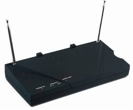 Двухантенная гитарная радиосистема VHF (174-223 MHz plug&play, регулятор громкости, выход 1/4" jack, блок питания в комплекте), с портативным передатчиком (фиксированная частота, регулятор громкости, ON/OFF переключатель, индикатор заряда батареи, питание 1 элемент 9В, время работы без подзарядки 8 часов).