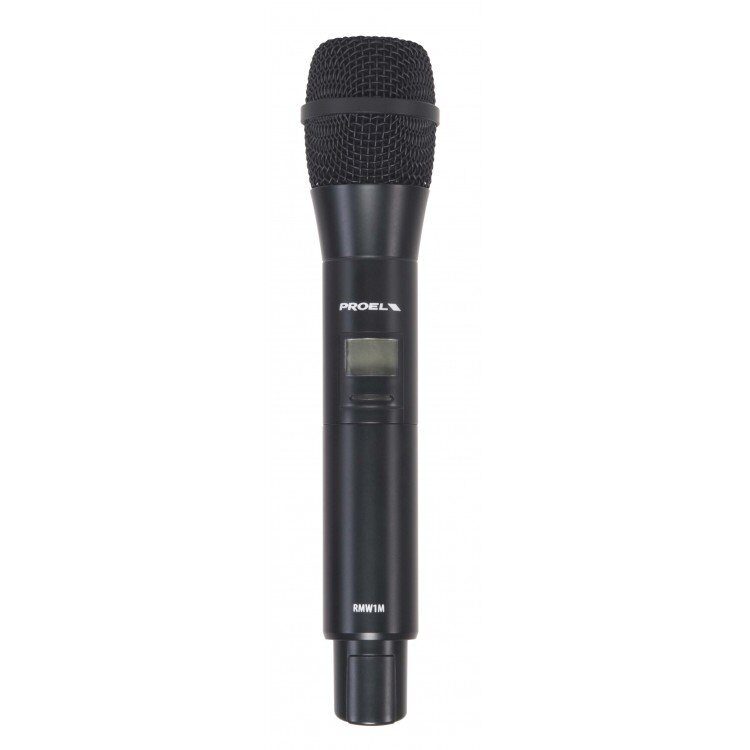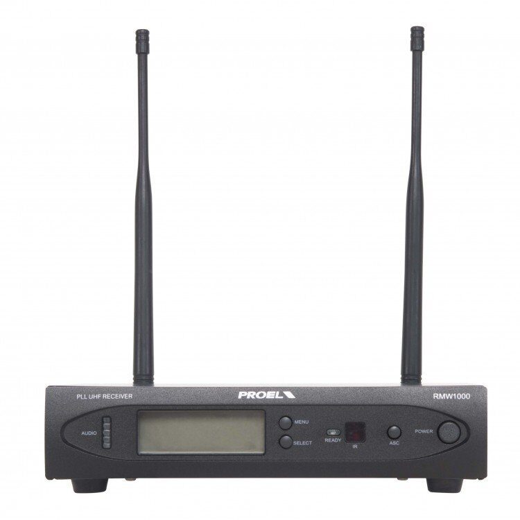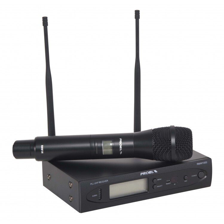 PROEL RMW1000M микрофонная радиосистема UHF диапазона, состоящая из ручного передатчика RMW1M с динамическим капсюлем и настольного 2-х антенного приёмника RMW1000.