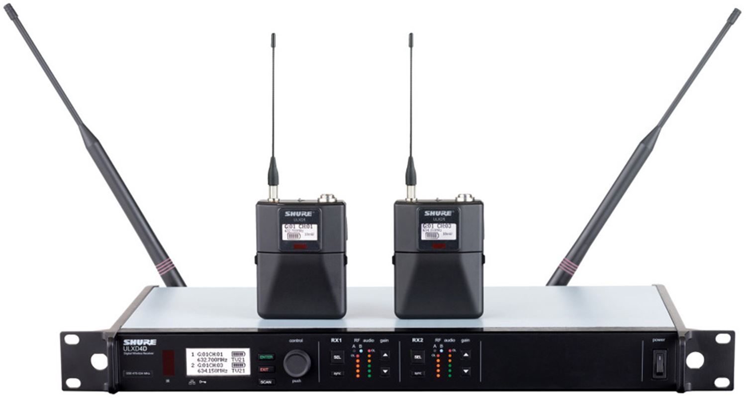 SHURE ULXD14DE P51 – двухканальная радиосистема из линейки ULX-D® Digital Wireless от знаменитого американского производителя. Это высокопроизводительная система профессионального уровня, которая позволяет передавать аудио сигнал в цифровом качестве 24 бит/48 кГц с помощью беспроводного соединения, обеспечивая чистый и четкий звук. Двухканальная система ULX-D® - это самое современное оборудование, намного опережающее продукцию конкурентов в своём классе, обеспечивающее бесперебойную передачу сигнала. Частотный диапазон от 20 Гц до 20 кГц и гладкая АЧХ дают возможность транслировать звук источника максимально естественно и точно, без искажений. При этом система отличается простотой и удобством настройки, имеет эргономичный и интуитивно понятный пользовательский интерфейс. Синхронизация приемника и передатчика осуществляется с помощью инфракрасного соединения. Для защищенной передачи используется 256-битное шифрование AES. Представленная конфигурация радиосистемы включает двухканальный рэковый приемник ULXD4D и два компактных поясных передатчика ULXD1 для подключения различных видов микрофонов или инструмента. Приемник заключен в прочный металлический корпус, оснащен двумя съемными антеннами, устанавливается в рэк (высота 1U). Система совместима с AXT600 Axient® Spectrum Manager. Для удалённого управления и мониторинга с использованием программного обеспечения Wireless Workbench® предусмотрено два порта Ethernet, возможна интеграция в сеть Dante. Настройки наглядно отображаются на контрастном жидкокристаллическом экране приемника с подсветкой. Передатчики также оснащены экраном с подсветкой, работают от двух батарей или аккумуляторов АА 1,5 В. Время непрерывной работы – более 11 часов при использовании литий-ионных аккумуляторов Shure SB900A. ULX-D® Wireless эффективно функционирует при расстоянии между приемником и передатчиками до 100 метров. Рабочий диапазон радиочастот представленной модели радиосистемы – Р51, от 710 МГц до 782 МГц.