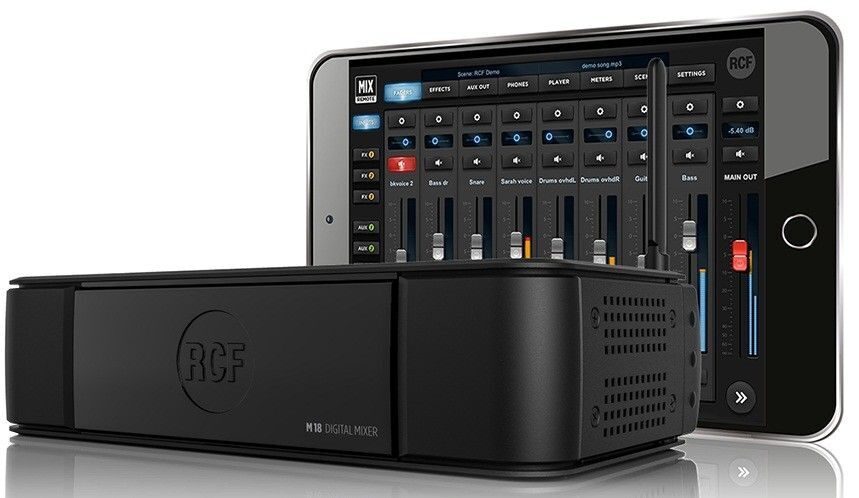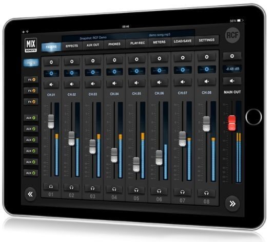 Для управления микшером предусмотрено специальное мобильное приложение RCF MixRemote. Примечательно, что данное приложение работает не только на iOS устройствах, но также доступно и для устройств на Android. Скачать и установить MixRemote можно бесплатно в магазинах App Store и Google Play. Управление микшером осуществляется исключительно с экрана устройства, однако можно подключить педаль и MIDI-контроллер для дополнительного управления некоторыми параметрами.