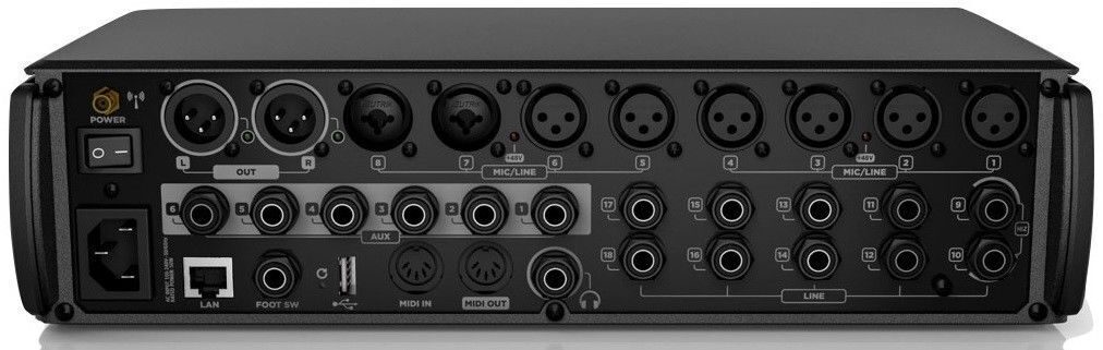 Цифровой микшер M18 оснащен 18 входами. В нем предусмотрено шесть микрофонных/линейных входов с XLR разъемами и два микрофонных/линейных входа на комбинированных XLR/TRS разъемах. Для подключения гитар предусмотрено 2 TRS входа с Hi-Z режимом. И для подключения всего остального имеется 8 линейных входов с TRS разъемами.