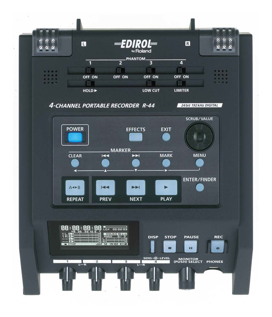R-44-R Компактный 4-х канальный рекордер. Несмотря на свои компактные размеры, обладает широкими возможностями. Позволяет записывать до 4 каналов несжатого 16 или 24 битного аудио с частотой сэмплирования 44.1 кГц, 48 кГц, 88.2 кГц или 96 кГц. Для хранения записанного аудиоматериала R-44 использует SD-карты (поддерживаются карты SDHC большого объема). Батарейки размера АА позволяют записывать до 4-х часов подряд.