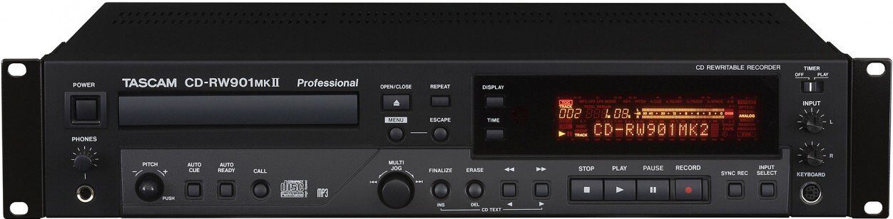 Tascam CD-RW901 MK2 - профессиональный CD-рекордер с возможностью воспроизведения MP3 для записи CD-R/CD-RW, рековый дизайн 2U, 24-битовые аналого-цифровые и цифро-аналоговые преобразователи. Несимметричные аналоговые вход/выход типа RCA. Коаксиальные и оптические входы/выходы SPDIF. Возможность преобразования частоты дискретизации. Регулировка уровня усиления на цифровых входах/выходах. Цифровой ввод/вывод звука с возможностью установки времени от 1 секунды до 24 секунд. Буфер RAM, Возможность программирования, Автоматическое или ручное перемещение фрагментов записи. Синхростарт (все фрагменты или один фрагмент), воспроизведение MP3. ПДУ беспроводной. Балансный вход/выход XLR, параллельный порт и RC-232C для удаленного управления, цифровой вход/выход AES/EBU, возможность каскадирования устройств, отображение ISRC кода на экране.