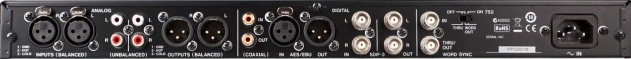 - Выход: 2 балансных аналоговых XLR, 2 небалансных аналоговых RCA, SPDIF стерео вход RCA, AES3 стерео XLR, SPDIF-3 стерео вход BNC, наушники 1/4` Jack.