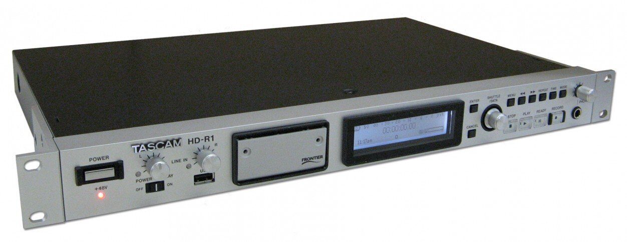 Tascam HD-R1 – устройство для записи и воспроизведения аудио сигнала, двуканальный рекордер высотой 1U для использования во многофункциональных звуковых комплексах. Используя высоконадежные карты памяти CompactFlash, HD-R1 способен записывать PCM файлы с максимальной частотой дискретизации 96 кГц или MP3 файлы с частотой 44.1/48 кГц и разрешением 16/24-бита в обоих случаях. Передача файлов может проводиться с помощью Ethernet подключения, USB или через устройство для чтения CF карт. Удаленное управление устройством возможно с помощью RS-232 подключения, через параллельный вход – Parallel, или RJ45, 100-Мбит Ethernet подключение.
