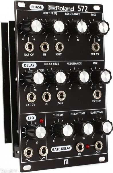 Roland System-500 572 - delay/phase для модульной системы SYSTEM-500. Один из 5 модулей SYSTEM-500. Основан на синтезаторе SYSTEM-100m. Включает пяти-ступенчатый phase shifter, аналоговый delay, gate delay, управляемый напряжением и LFO. Phase shifter имеет управление частотой и диапазоном резонанса, варьирующимся от едва заметного до глубокого, яркого аналогового эффекта. Точно так же, delay имеет независимые регуляторы времени и резонанса для коротких модуляций delay с эффектом chorus. Вместе phase shifter и delay может модулироваться встроенной огибающей от 572 модуля или внешними CV сигналами и настраиваться по силе эффекта с панели или CV сигналов. Секция LFO имеет регулятор настройки частоты и включает разъемы для нормальных и инвертированных джеков. Gate delay имеет регулятор для управления threshold, delay и временем gate для изменения поступающего сигнала с других модулей. Секция PHASE SHIFTER оснащена ручками MODULATION, SHIFT FREQUENCY, RESONANCE, MIX. Секция DELAY оснащена ручками MODULATION, TIME, RESONANCE, MIX. Секция LFO оснащена ручкой FREQUENCY. Секция GATE DELAY оснащена ручками THRESHOLD, DELAY TIME, GATE TIME. Также модуль имеет индикаторы LFO и GATE DELAY OUT.