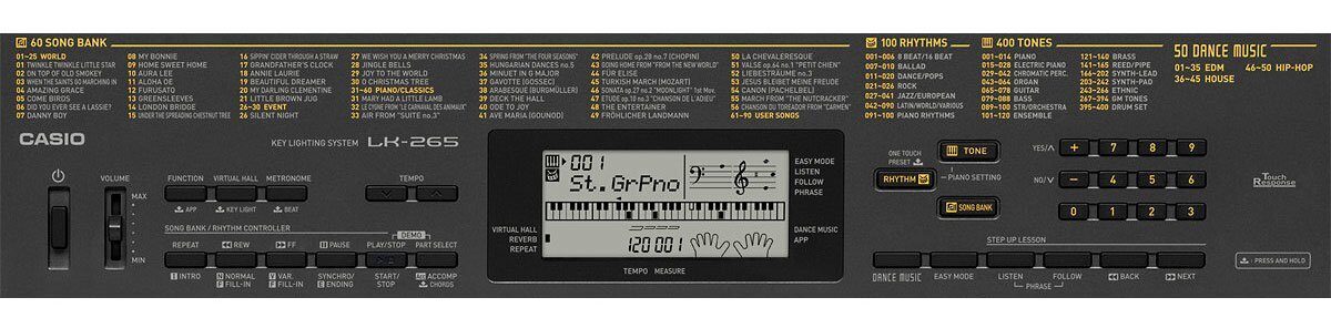 Синтезатор CASIO LK-265 разработан под потребности начинающих музыкантов. Он наделен пошаговой системой обучения. Помимо голосовых подсказок, юному музыканту помогут и визуальные: информация с дисплея и подсветка клавиатуры. Учебный процесс предполагает разучивание 110 встроенных музыкальных композиций и разделен на четыре этапа.