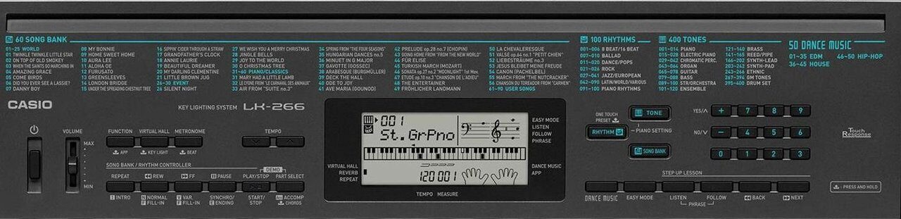 CASIO LK-266 – многофункциональный компактный синтезатор с 61 клавишей фортепианного типа, чувствительными к силе нажатия (2 уровня чувствительности, её также можно отключить). Особенность представленной модели – подсветка клавиш, которая поддерживается также при использовании современного приложения Chordana Play. Доступно 400 предустановленных тембров и 100 различных ритмов, танцевальные ритмы, различные эффекты, в том числе 10 типов реверберации. Имеется метроном и собственная высококачественная акустическая система. Элементы коммутации включают разъем для подключения педали, выход для подключения наушников или внешней акустической системы, вход стерео мини джек для подключения внешних источников и микрофонный вход для динамических микрофонов. Режим обучения даёт возможность отработать движения отдельно каждой руки и затем потренироваться в исполнении обеими руками, в том числе повторяя прослушанные отрывки. Имеются режимы повтора, руководство по исполнению с нотного листа голосом, а также оценка качества игры. CASIO LK-266 имеет небольшие размеры, эргономичный низкопрофильный дизайн, а его вес 3,6 кг позволяет легко переносить инструмент и заниматься в любом удобном месте. Синтезатор может работать как от сетевого адаптера, так и полностью автономно, питаясь от шести батарей типа АА 1,5 В. Время непрерывной работы от батарей – до 6 часов. Для экономии заряда батарей инструмент автоматически отключается после получаса простоя.