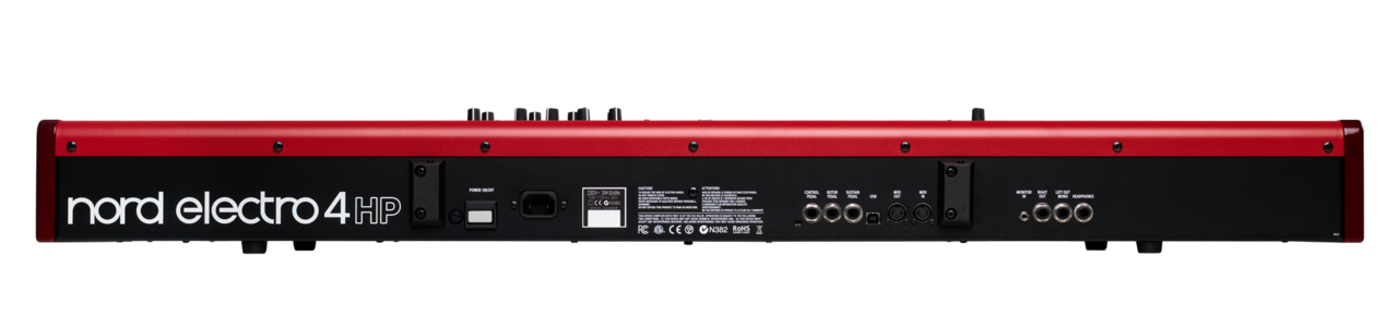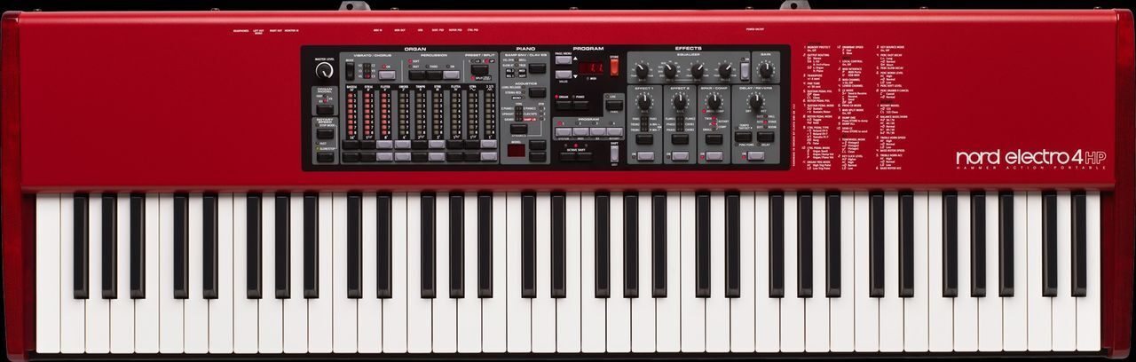 Clavia Nord Electro 4 HP синтезатор имеющий 73 клавиши с молоточковой механикой, предназначенный для музыкантов использующих тембры электромеханических органов, электропиано, клавинетов и мелотронов. Модель имеет новые физические регистры и колесного органа от Nord C2D, а также USB-MIDI. Инструмент оснащен полувзвешенной «органной» клавиатурой с профилем waterfall, имеющим скругленную грань для простоты извлечения глиссандо, и три секции органную - слева и электропиано и эффектов справа.