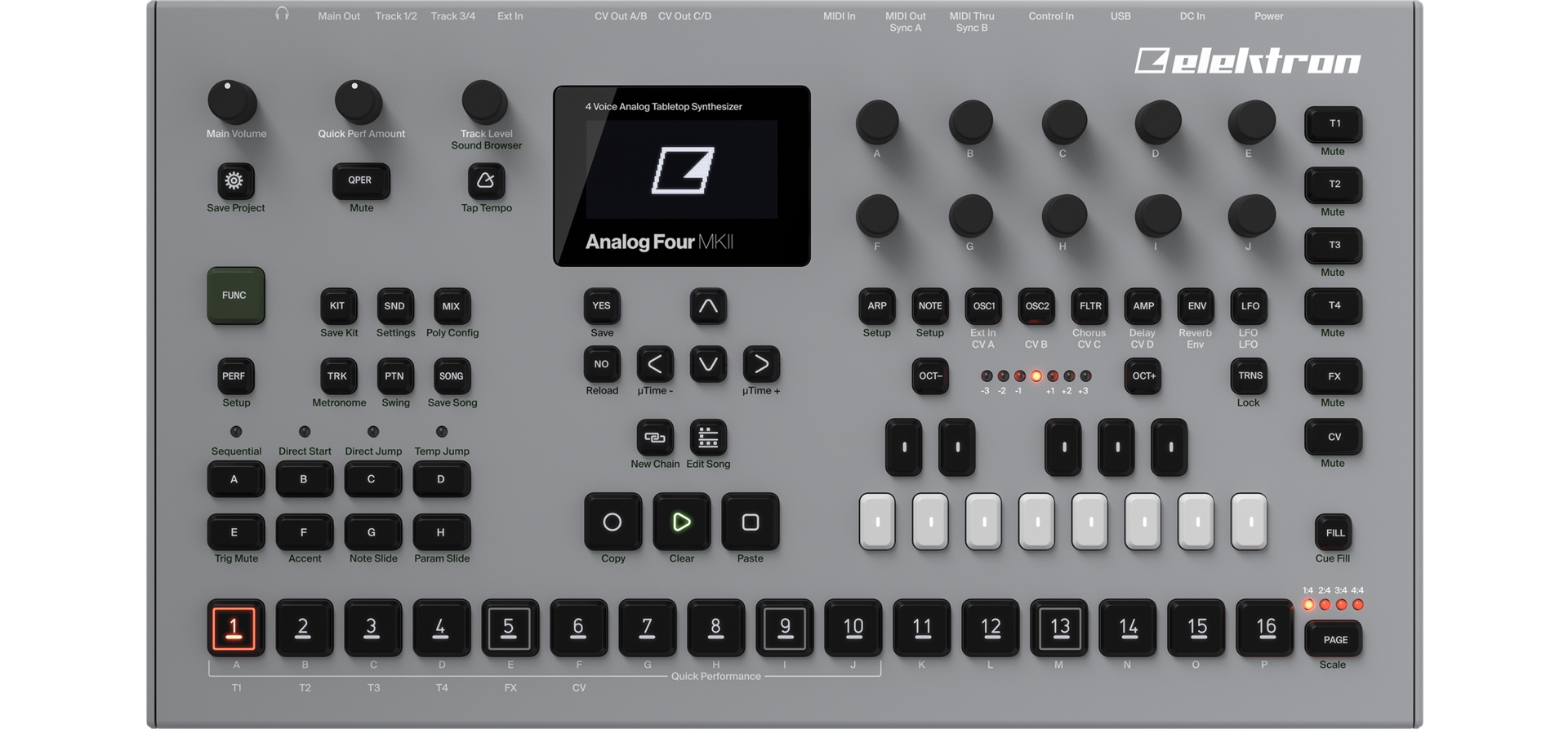 Elektron Analog Four MKII - улучшеная модификация четырёхголосного аналогового синтезатора Elektron Analog Four. Надёжные кнопки и энкодеры с высочайшим разрешением, OLED дисплей с широким углом обзора и повышенной чёткостью, независимые выходы на каждый голос.