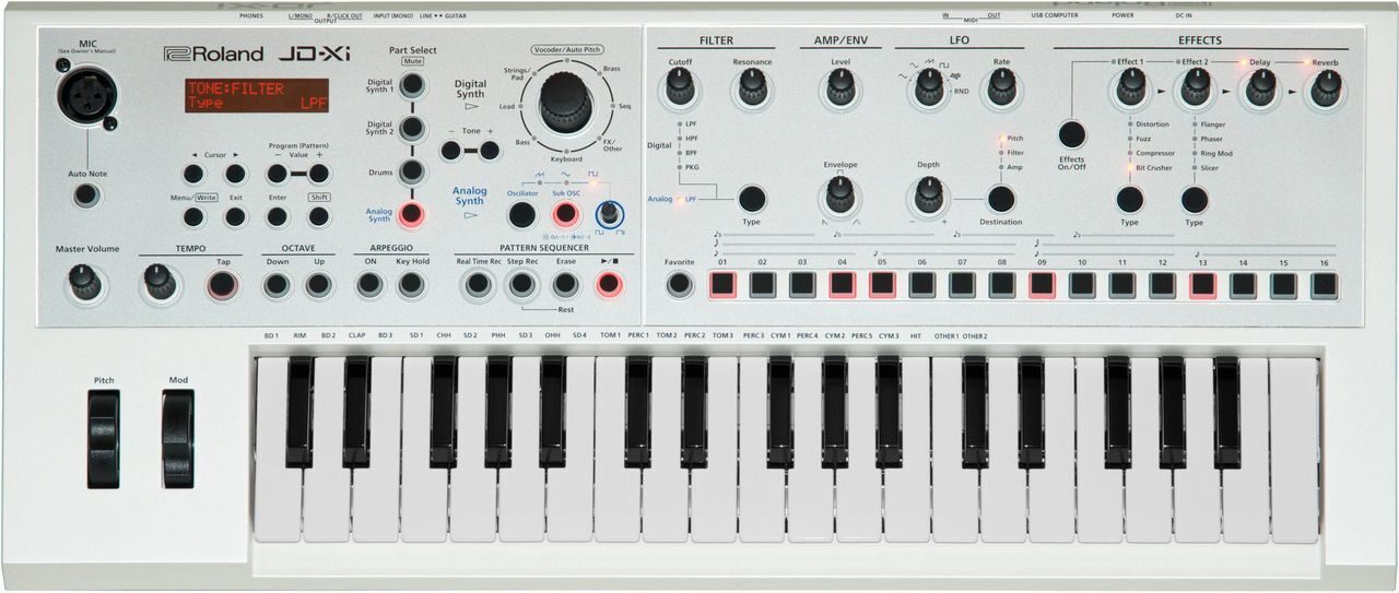 Интерактивный аналогово-цифровой ситезатор ограниченной серии JD-Xi – один из самых востребованных в США, ведь он предлагает уникальный звуковой движок с кроссовером и теплым, гладким классическим аналоговым звуком в сочетании с четкостью и универсальностью современных цифровых синтезаторов. Он позволит вам насладиться жирным аналоговым басом и лидами, возможностью тонкой настройки, а также полифоническими инструментами типа электропиано, баса, гитары и многих других.
