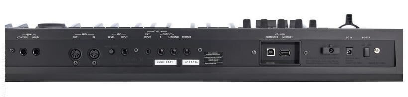 Для педалей и ножных переключателей в наличии есть два входа на разъемах 1/4'' Jack TS. Подойдут опциональные футсвичи из серии DP и педаль экспрессии EV-5. Для внешнего динамического микрофона есть вход на разъеме 1/4'' Jack TS, а смартфон или плеер можно подключить к входу на разъеме 1/8'' Jack TRS. Таким же разъемом представлен и выход для наушников. Вывести звук на акустическую систему или микшерный пульт можно с помощью стереофонического выхода на двух разъемах 1/4'' Jack TS. Для работы с внешним оборудованием имеется MIDI-интерфейс с входом и выходом на стандартных 5-контактных разъемах. Для флеш-карт есть порт USB-A, а подключение к компьютеру происходит с помощью порта USB-B.