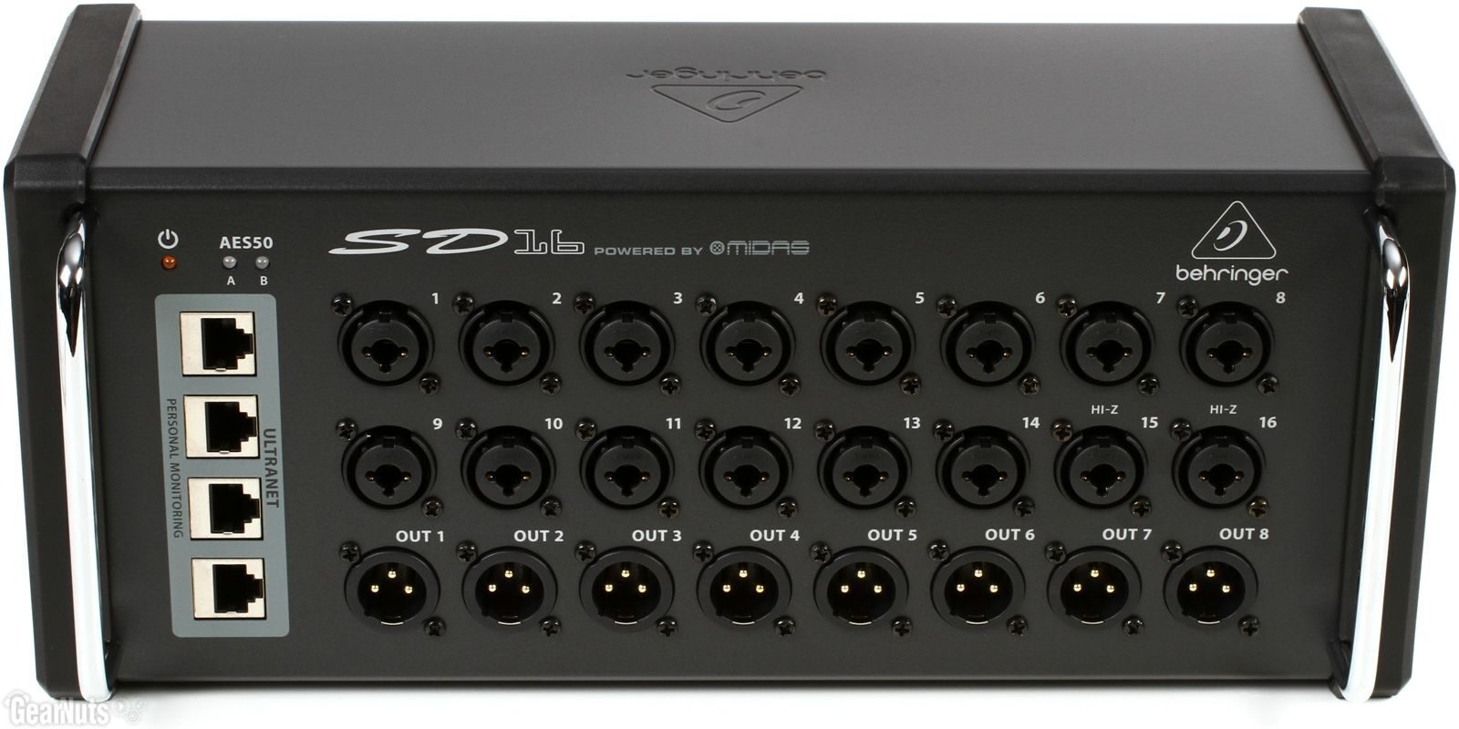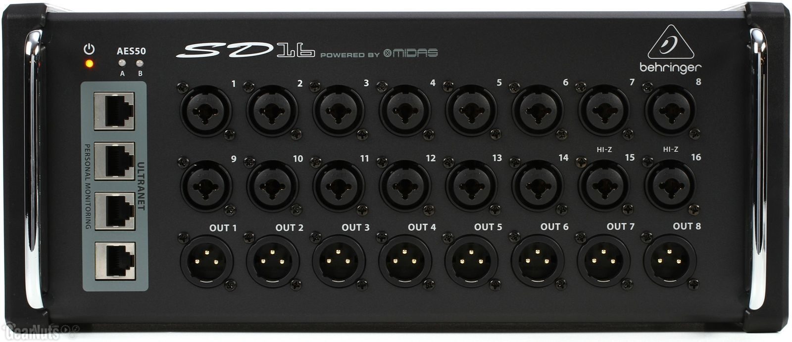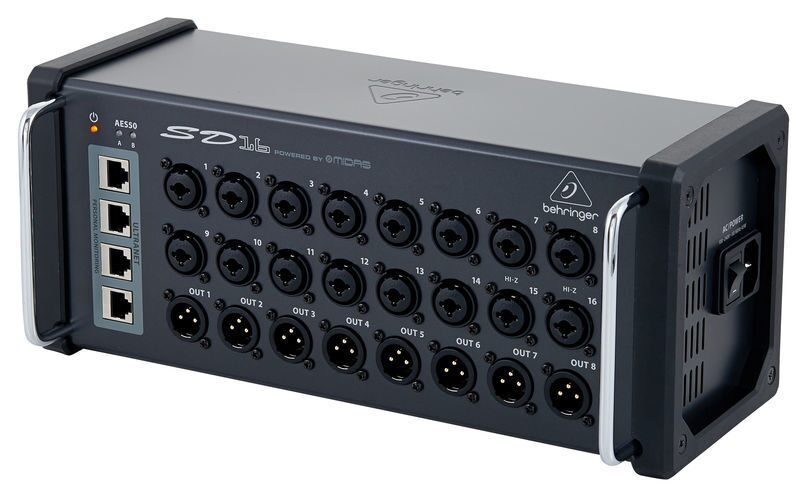 Модель SD16 – коммутационный сценический блок AES50. Стейджбокс располагает восемью балансными выходами, выполненными на разъемах XLR, и шестнадцатью микрофонными предусилителями Midas с функцией программирования. Предусмотрено использование в качестве стандартного мультикора с аналоговыми микшерами либо системами персонального мониторинга. Кроме того, поддерживается подсоединение по Ethernet-кабелю длиной максимум 100 метров.