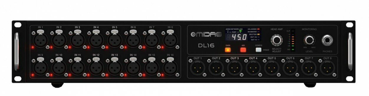 - MIDAS DL16 располагает 16 входами и 8 выходами, включает в себя 16 полностью программируемых и дистанционно управляемых микрофонных предусилителей Midas, такими же как в больших консолях серии PRO, и оснащены переключаемым + 48В фантомным питанием. Кроме того, DL16 имеет 8 сбалансированных цифровых выходов с низким уровнем сопротивления, так как все входы и выходы DL16 были предназначены для обработки как сбалансированных и несбалансированных сигналов, устраняя любые опасения по поводу ухудшения качества сигнала, шума и перекрестных помех. DL16 также имеет двойной Cirrus Logic цифроаналоговых преобразователей, что обеспечивает снижение уровня шума и более низкое искажение и пост-DAC фильтрации для удаления широкополосного шума.