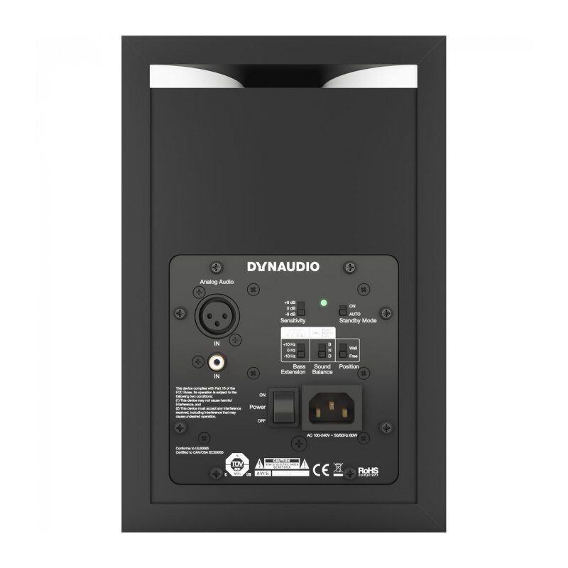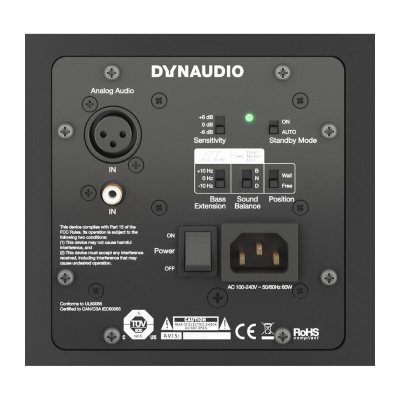 На тыловой панели Dynaudio LYD 5 можно найти аналоговый балансный вход на XLR, небалансный вход на RCA для бытовых источников, а также несколько переключателей: позиции в помещении, басового обрезного фильтра, чувствительности на входах и баланса (три предустановленных режима фильтра), также есть переключатель Standby Mode, который управляет автоматическим отключением.