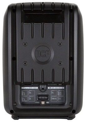 Спереди в нижней части колонок расположен фирменный идикатор питания. В режиме энергосбережения эмблема RCF подсвечивается красным цветом, а при включении мониторов ярко загорается белым цветом. Самое любопытное, что металлические буквы в логотипе RCF оснащены сенсорным датчиком, то есть служат кнопкой перевода мониторов в STAND BY.