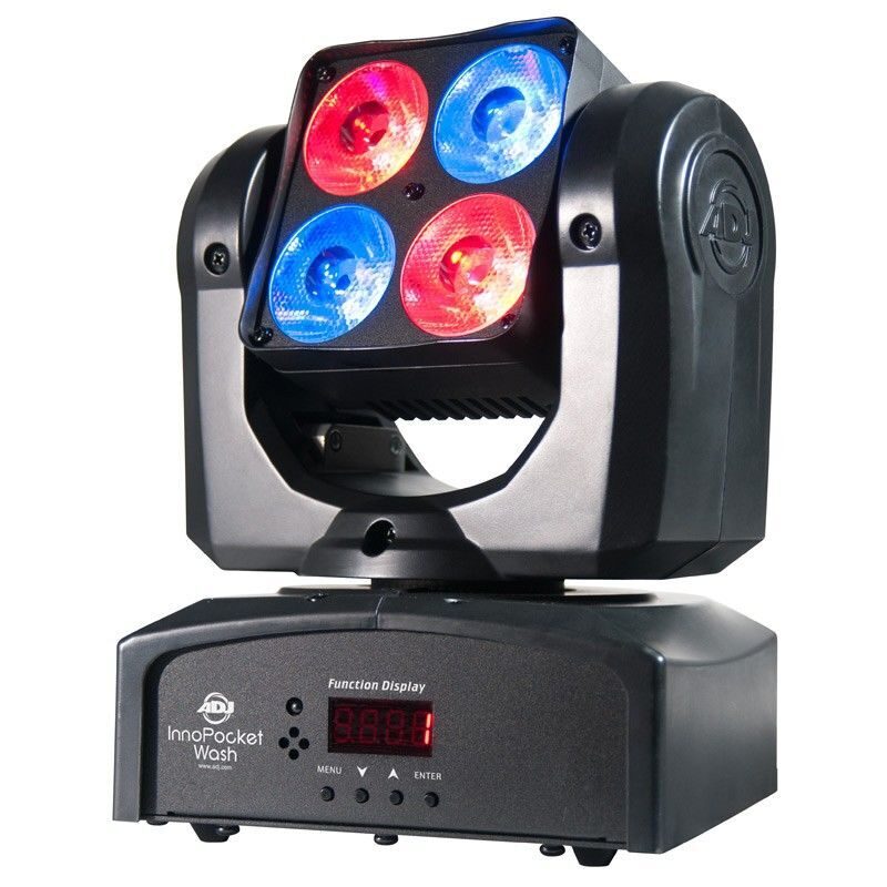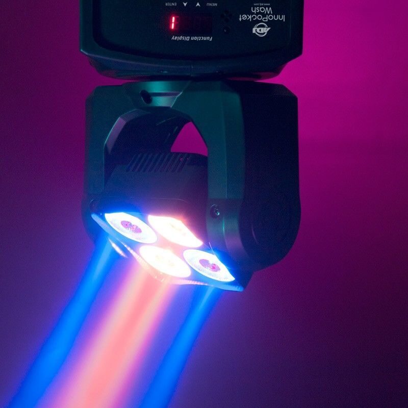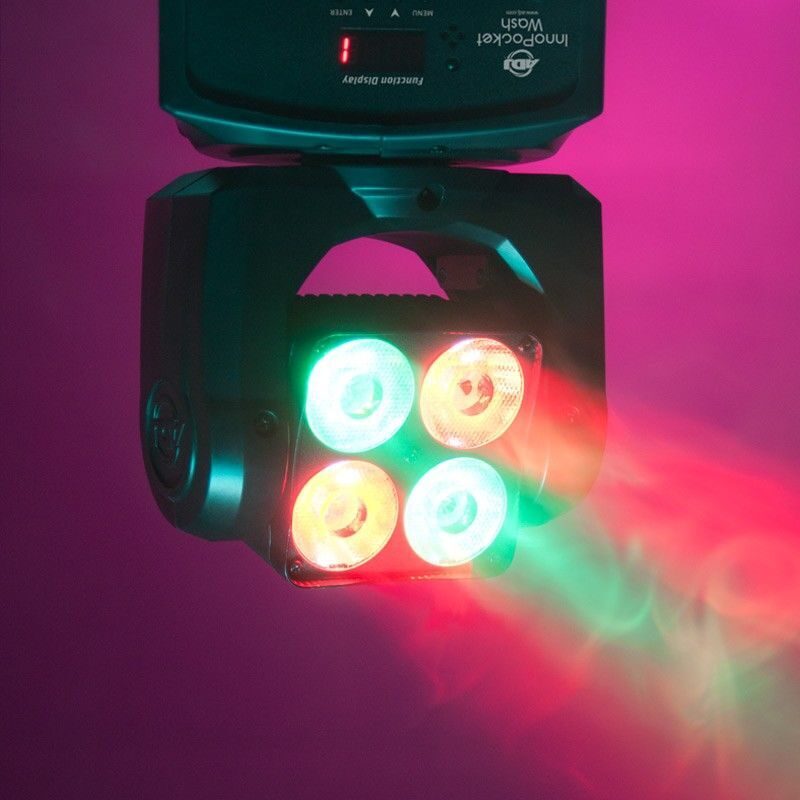 Устройство Inno Pocket Wash с 4 светодиодами Quad 4-в-1 (RGBW – красный, зеленый, синий и белый) мощностью 10 Вт каждый дает чистое наслаждение цветом благодаря быстровращающейся голове и цветному омывающему освещению превосходного качества. Устройство имеет режим инверсии панорамы и наклона, который позволяет при объединении голов выполнять противоположные действия.