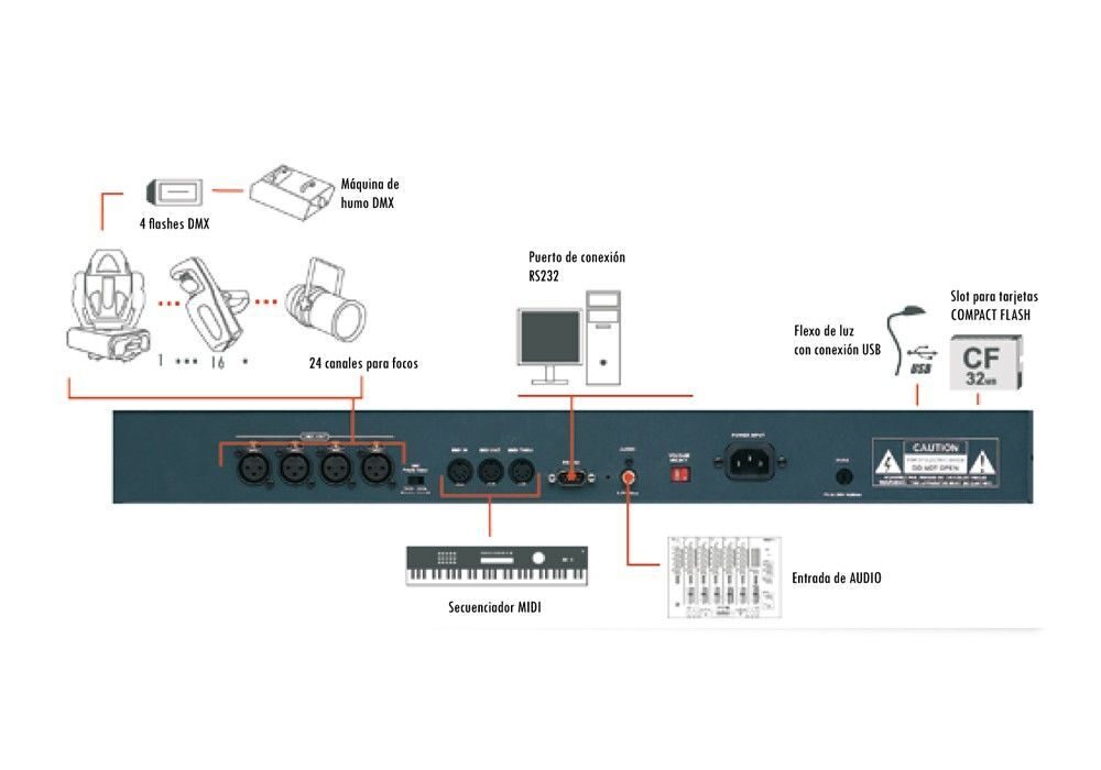 8 канальных контрольных каналов для управления стробоскопами, 24 контрольных канала для управления статическими приборами типа PAR, 36 контрольных каналов на каждый динамический прибор..