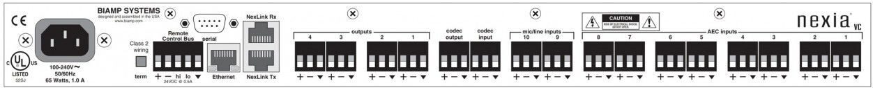 Nexia VC производства Biamp — цифровая платформа для видео конференций. Имеет 8 микрофонных/линейных входов с функцией эхоподавления AEC, 2 стандартных микрофонных/линейных входа, 4 балансных микрофонных/линейных выхода, интерфейс кодека ВКС с балансными линейными входом и выходом.