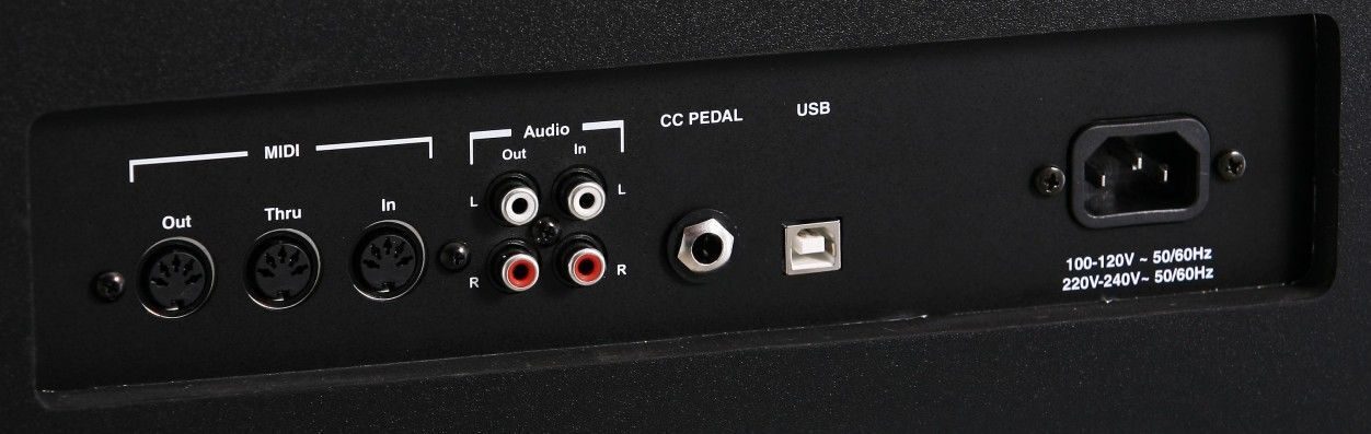 - Разъемы: MIDI (In/Out/Thru), MIDI USB-интерфейс, 2х небалансные линейные выходы RCA джеки, 2х небалансных входа RCA, 2х выходы на наушники